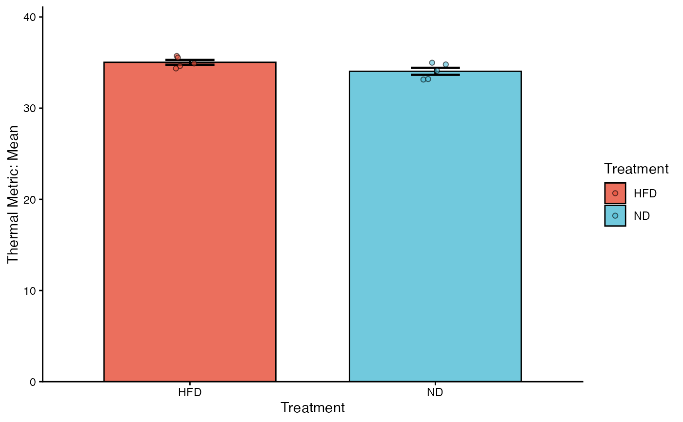 Creates a high-quality bar plot to compare thermal metrics across experimental groups. The visualization includes bars representing the mean, customizable error bars (SD or SE), and overlaid individual data points to show biological variation.